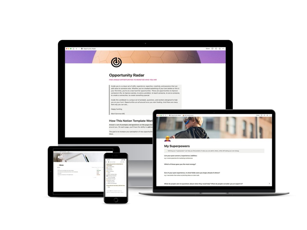 Inside this workbook is a unique set of prompts, questions, and sections designed to help you start seeing new opportunities all around you: opportunities for a new career, new side-hustle, new projects.